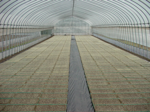 写真のような形式で水稲苗を育成します。 播種3日後くらいで芽が出てきます。この状態を出芽苗といいます。 出芽苗をハウスに並べ、約20日くらい管理し、植えられる状態になったものを硬化苗といいます。 田植え作業の風景へ